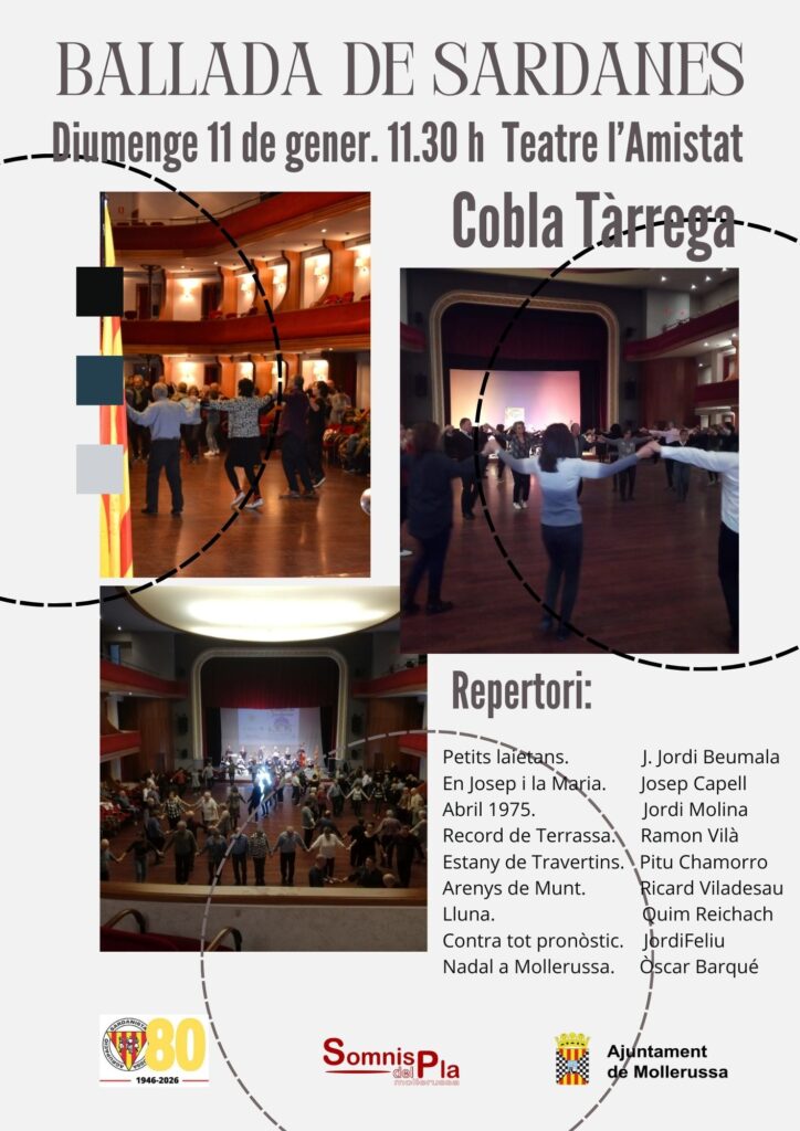 La ballada d’aquest diumenge 11 de gener enceta l’agenda sardanista de l’Agrupació de Mollerussa per aquest any 2026. Les seguiran en el calendari de les ballades de Diumenge de Rams el dia 29 de març amb la cobla Vents de Riella i la del dia 27 d’abril, diada de la Mare de Déu de Montserrat amb la cobla Jovenívola d’Agramunt.